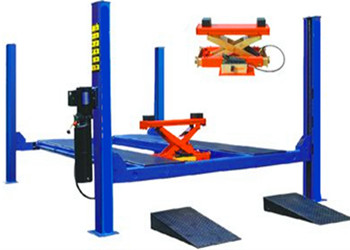 汽修專用舉升機(jī)屬于一種特殊液壓升降機(jī)有剪叉式、雙柱式、四柱式、另外有對稱式和非對稱式區(qū)分。對稱式舉升機(jī)四根臂的臂長大致相等,這樣使得汽車中心(或質(zhì)心)處于立柱的中間位置,對于皮卡和箱式貨車等類型的汽車的日常維修來說這種對稱式舉升機(jī)可能是最佳的選擇。但是對于一些柱間寬度不夠大的對稱式雙柱式舉升機(jī)來說,汽車舉升后不能打開車門是一個(gè)很大的缺點(diǎn)。非對稱式舉升機(jī)的立柱向后旋轉(zhuǎn)了一個(gè)角度(大約30°),并且前臂比后臂稍微短一些。當(dāng)把汽車停放到這種非對稱式的舉升機(jī)適當(dāng)位置時(shí),車的位置就向后移動(dòng)了一些,因此,我們就很容易地從車門進(jìn)出。而且,這種非對稱式舉升機(jī)轉(zhuǎn)動(dòng)的立柱,可以確保車輛的重心安全地定位在立柱之間。